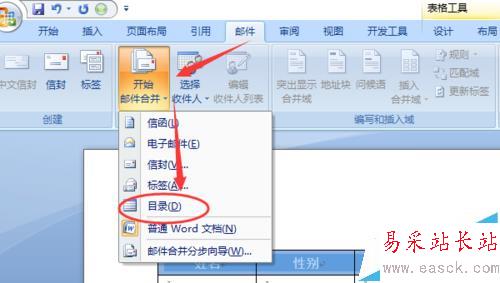 3、打開郵件選項卡找到開始郵件合并按鈕,單擊其下面的目錄按鈕。