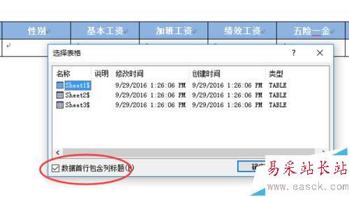6、在彈出的選擇表格窗口中,選擇sheet1,勾選上數據首行包含列標題。單擊確定按鈕