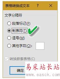 在彈出的“表格轉(zhuǎn)換成文本”對(duì)話框中,勾選“制表符”一項(xiàng),然后點(diǎn)擊“確定”完成轉(zhuǎn)換。