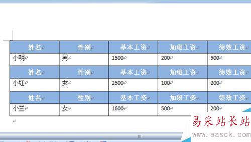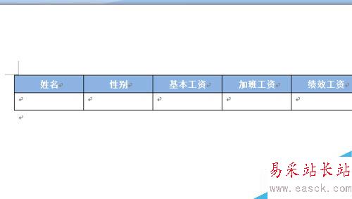 2、打開word,制作我們的工資條。表頭與excel中的一致。這里將表頭進行了設置,底紋設置成藍色,字體設置成白色,并且水平居中、垂直居中。這些設置比較簡單。