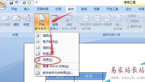 3、打開郵件選項卡找到開始郵件合并按鈕,單擊其下面的目錄按鈕。