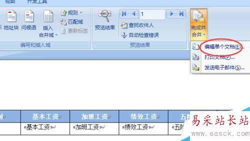 8、現在的工作已經接近完成了,只需要將數據填充進來,在郵件選項卡,單擊完成并合并下面的編輯單個文檔按鈕。