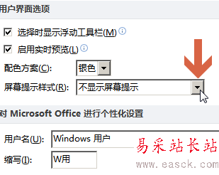 4、在“常規”選項卡中的“屏幕提示樣式”項中如果設置成“不顯示屏幕提示”。則鼠標指針指向功能按鈕后不會顯示功能提示。如果想顯示提示,先用鼠標點擊該項。