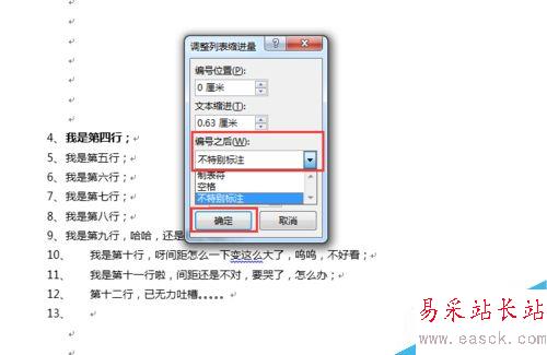 將 “編號之后”由原本的“制表符”改為“不特別標注”,點擊確定