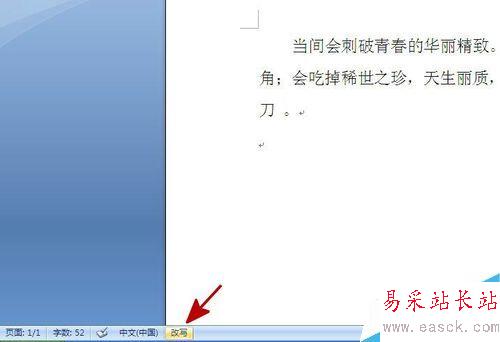 3、我們來(lái)看一下word工作文檔下面的狀態(tài)欄,有一處顯示著“改寫(xiě)”,意思就是鍵入的文字會(huì)覆蓋現(xiàn)有的內(nèi)容,等于替換了。