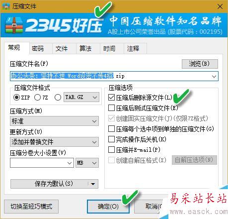 在“常規”選項卡中,選中“壓縮后刪除源文件”復選框。點擊“確定”壓縮。這樣壓縮后,用密碼打開壓縮包才能訪問Word文檔,而原來的文件在壓縮結束時已經被自動刪除掉了。