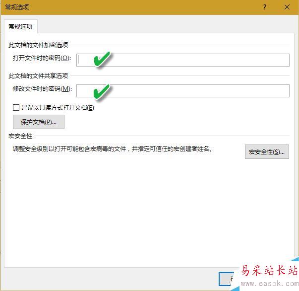在權限設置窗口中,設置文件打開時候的密碼,還可以設置修改文件時的密碼。二者可分別或者同時設置。