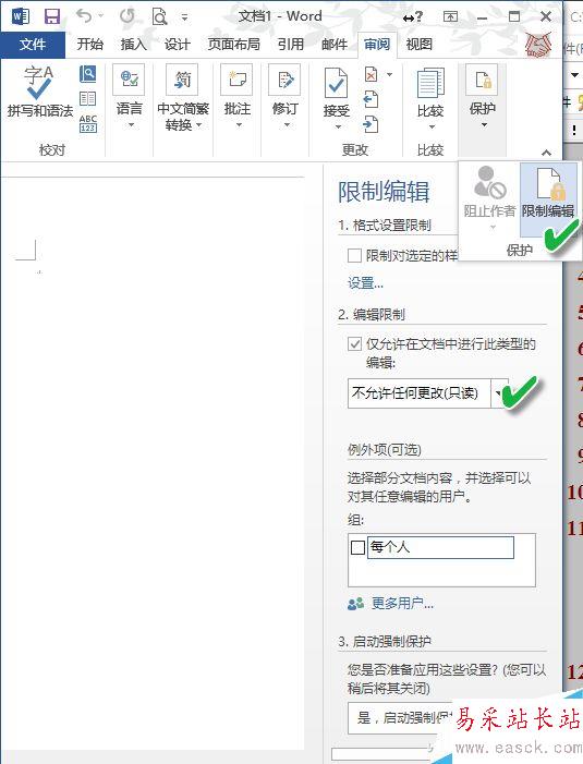 限制編輯的第二種方法是通過“審閱→保護→限制編輯”,在編輯限制設定下拉列表中,將“編輯限制”區域更改為“不允許任何更改(只讀)”模式,然后點擊“是,啟動強制保護”。這樣也能設定對文檔編輯的限制,打開后只能閱讀文檔了。