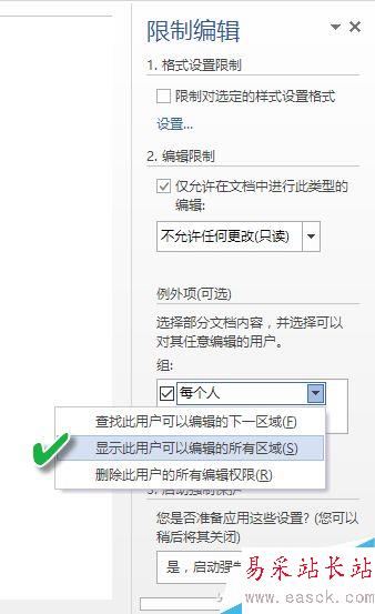 如果要設定對文檔部分內容的不同權限限制(給不同人不同使用權限),可在選擇部分文檔內容后,選擇格式設置限制類別,然后選擇限制編輯的類型,再點擊勾選“例外項”下面的“每個人”,對不限制的區域進行設置。啟動強制保護即可。