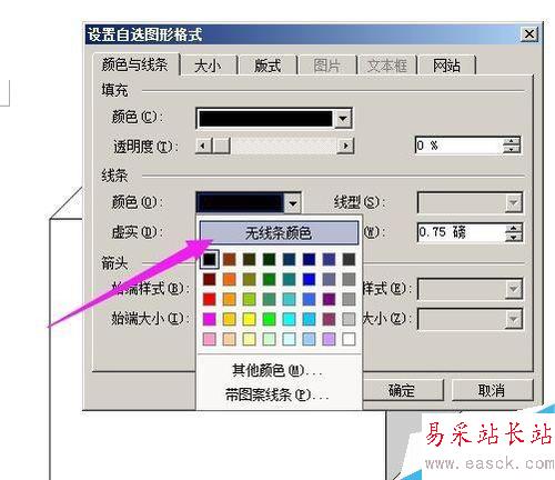 在“線條顏色”這里點下三角形;彈出的顏色選項中點選“無線條顏色”;