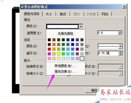 在“填充顏色”這里的三角形點下,彈出的菜單中點“填充效果”;