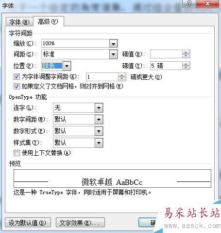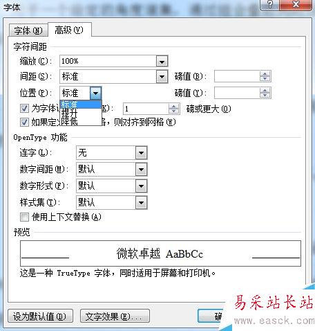 3、在選擇“字體”選項后,彈出來的對話框,點擊“高級”選項,下面藍色方框處,“位置”選項后面,下拉選擇“標準”點擊“確定”之后,你在回到文檔,是否發現鼠標變回正常狀態了。