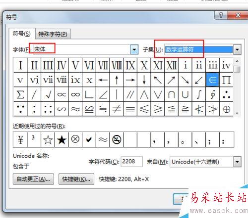 4、字體選擇宋體,子集選擇數學運算符,插入。