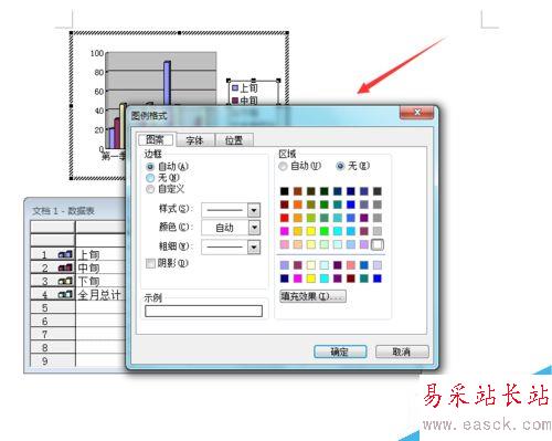 8、我們還可以更改圖例的顯示顏色,在圖例上選擇顏色的標簽,雙擊鼠標左鍵彈出圖例格式設置對話框,如圖所示: