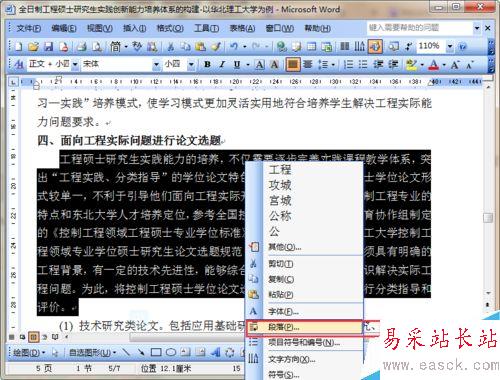 選中正文,點擊右鍵,選中“段落”,如圖所示;