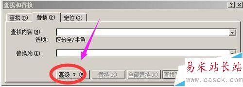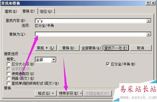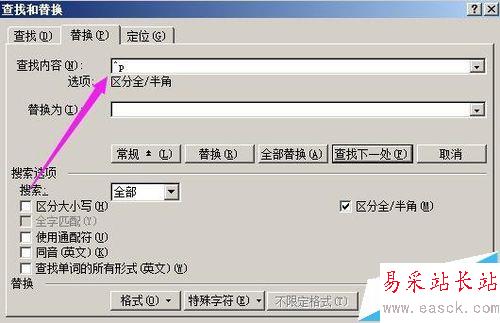 5、然后,在”替換為“側邊編輯框這里點下,然后,再點“特殊字符”,在彈出的菜單中點“段落標記”;