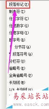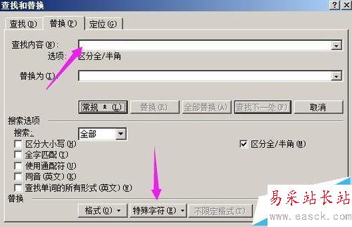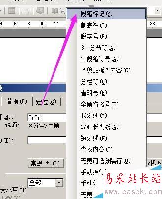 3、然后,在“查找內容”側邊編輯框這里點下,再點“特殊字符”,在彈出的菜單中點“段落標記”;