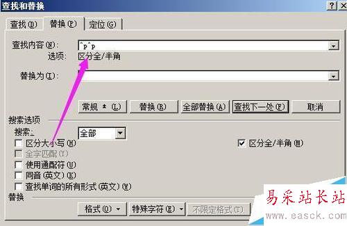 4、“查找內容”側邊的編輯框這里即顯出一個段落標記,如圖所示;然后,再重復操作一次,在"查找內容“側邊編輯框這里再顯出一個段落標記,如圖所示。