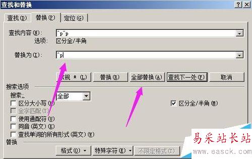 6、在”替換為“側邊的編輯框內即顯出一個段落標記,如圖所示。然后點”全部替換“;第一段落與第二段落之間的間隔即被縮小。如圖所示。