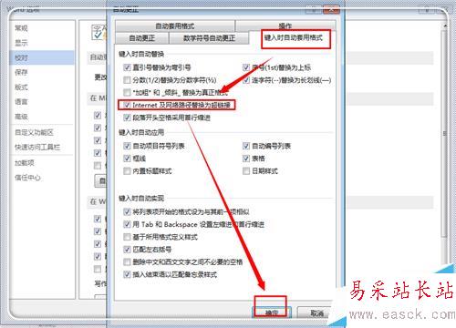 4、在自動更正選項欄目下,點擊“鍵入時自動套用格式”,然后將internet及網絡路徑替換為超鏈接前面的勾打上,然后點擊“確認”,