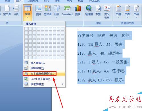 1、如圖所示,選中需要轉換的文檔內容,然后點擊插入---表格命令,進行插入表格的設置。有一個前提是文檔輸入的時候需要按照一定的規律,用逗號或者空格等符號隔開。