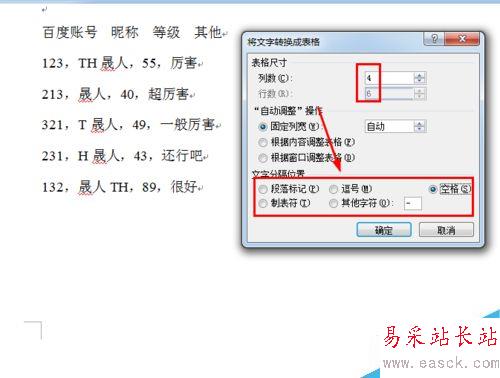 3、輸入表格的行,列,一般系統會默認識別數據的,我們需要設置選擇的就是文字的分割位置,如圖所示,選擇一種符合要求的格式點擊確定。