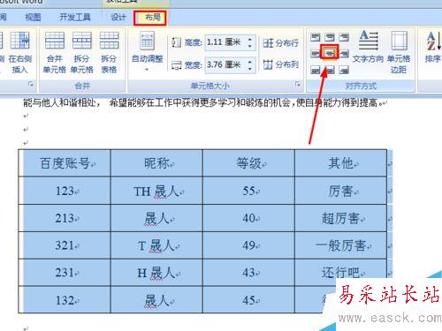 5、點擊布局中的,對齊方式,選擇水平居中,讓表格的文字排列更加美觀,如圖所示,如果需要改變顏色的個性化的設置的話就自行修改。
