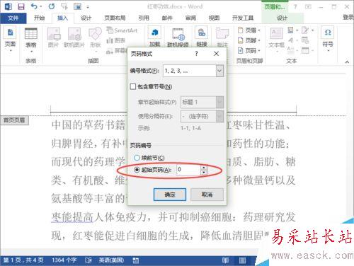 七、在頁碼格式對話框中,將起始頁碼選項設置為“0”,再點擊“確定”按鈕。如圖所示;