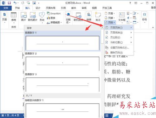 三、在插入選項卡中,依次點擊“頁眉和頁腳”功能區的“頁碼”-->“頁面頂端”選項,在頁面頂端選項框中,選擇一個樣式。如圖所示;