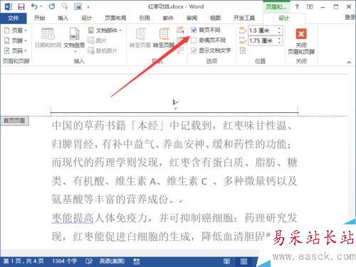 四、樣式選擇好以后,在Word文檔的頁眉中插入了頁碼樣式。在設計選項卡下的選項功能區選中“首頁不同”。如圖所示;