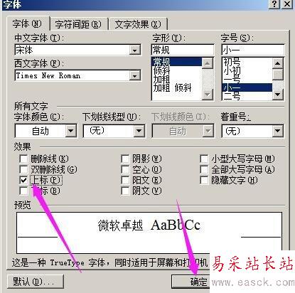 6、彈出對話框,在框內的“上標”這里打上勾,如圖所示,然后點確定。