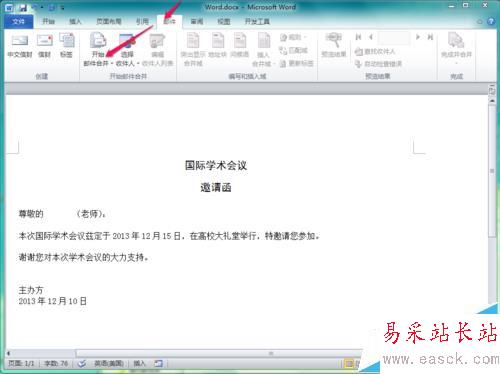 2、我們把鼠標放置需要插入姓名的位置 點擊郵件選項卡中的開始郵件合并 如圖