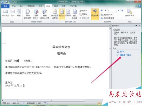10、最后我們選擇編輯單個信函 默認按確定即可 此時會批量生成邀請函 如圖