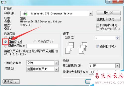 6、在頁面范圍的選項(xiàng)里找到當(dāng)前頁選項(xiàng),勾選前面的單選按鈕,點(diǎn)擊確定,這樣我們打印出的就是我們需要的了,如圖所示: