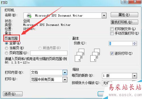 5、在這個(gè)打印設(shè)置對(duì)話框內(nèi)找到頁面范圍選項(xiàng),如圖所示: