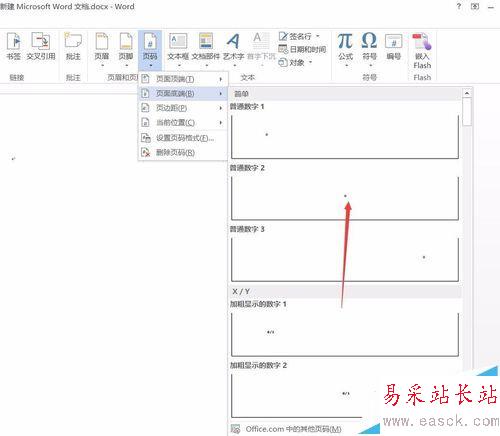 5、點(diǎn)擊【頁碼】下拉菜單中的【頁面底端】,選擇需要的頁碼顯示方式,我們選擇【普通數(shù)字2】
