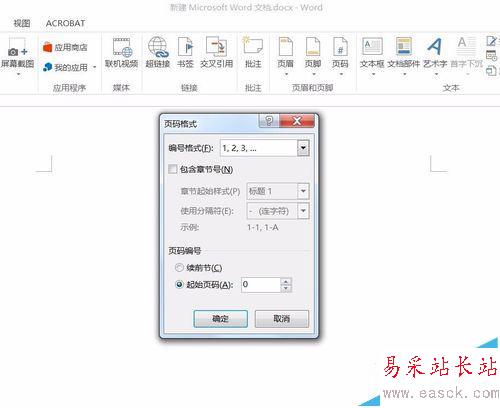 4、點(diǎn)選【起始頁碼】將后面的數(shù)值改為0。點(diǎn)擊【確定】。