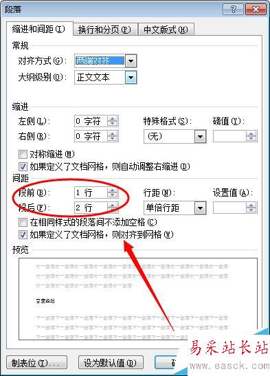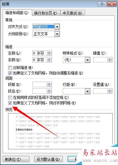 2、在打開的段落屬性界面中,找到間距那一項(xiàng),去掉“如果定義了文檔網(wǎng)絡(luò),則對(duì)齊到網(wǎng)格”前面的勾。