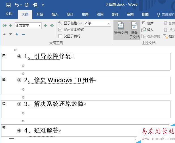 繼續(xù)在“大綱”選項(xiàng)卡中,全選所有2級(jí)標(biāo)題,點(diǎn)擊“顯示文檔→創(chuàng)建”,即可創(chuàng)建子文檔了。