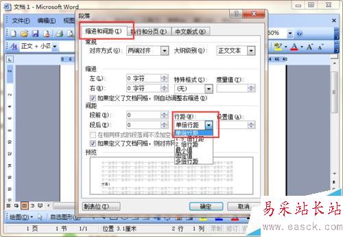 3、修改行距:在調節界面中找到行距選項,選中“單倍行距“,單擊確定;