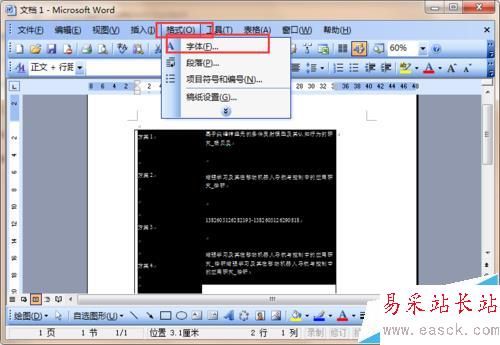 1、找到命令:點擊菜單欄中的“格式”,在下拉菜單中選中“字體”;