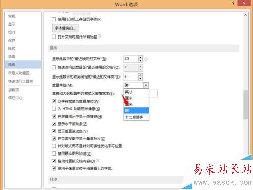 2、在選項(xiàng)中找到高級(jí)——顯示——度量單位,我們以英鎊為例,修改并確認(rèn)