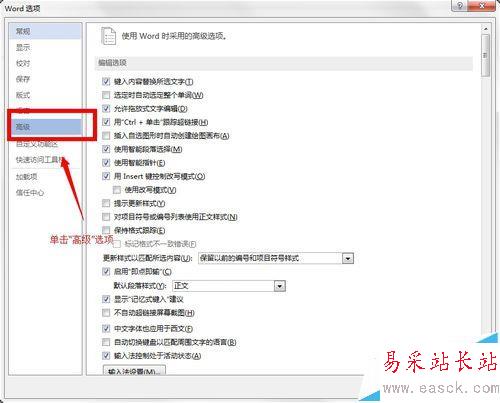 3、在打開的“word選項”卡中的左側找到“高級”選項