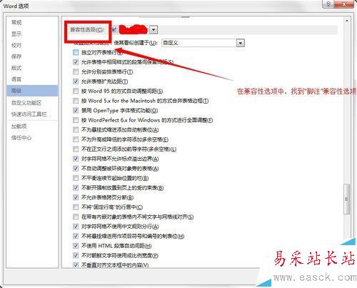 4、在選中“高級”選項后,在右側找到“兼容性選項”。在其子內容中找到“按word 6.x/95/97的方式安排腳注”,勾選該內容。