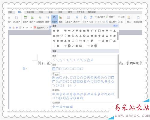 2、我們點擊菜單欄切換到【插入】菜單,然后我們點擊插入菜單下的形狀,在彈出的形狀菜單中找到矩形,點擊矩形中的第一個,我們就可以畫出矩形了。