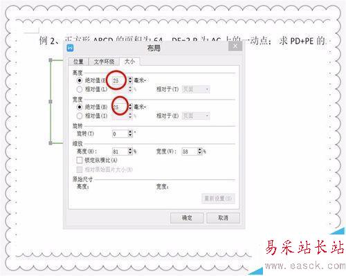 5、在對話框中,切換選項卡到最后的大小選項,然后我們把寬度和高度調(diào)整為相同的數(shù)值,最后點擊確定。