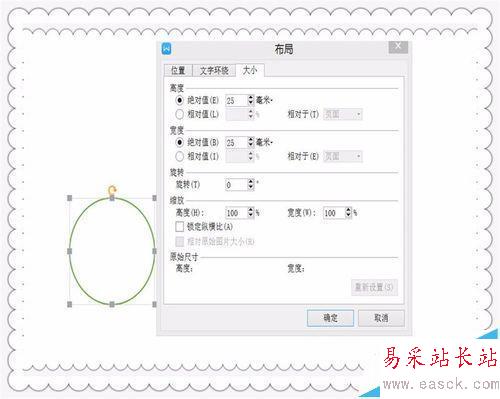 7、其實,畫圓的方法和畫正方形的方法完全一樣,我們把大小選項卡中的高度和寬度設(shè)置相同,就可以畫出一個正圓了,因為圓的直徑都相同