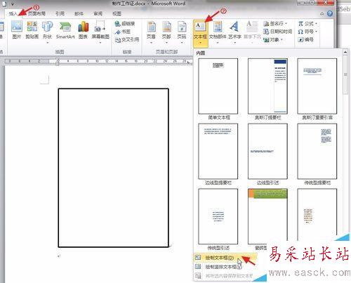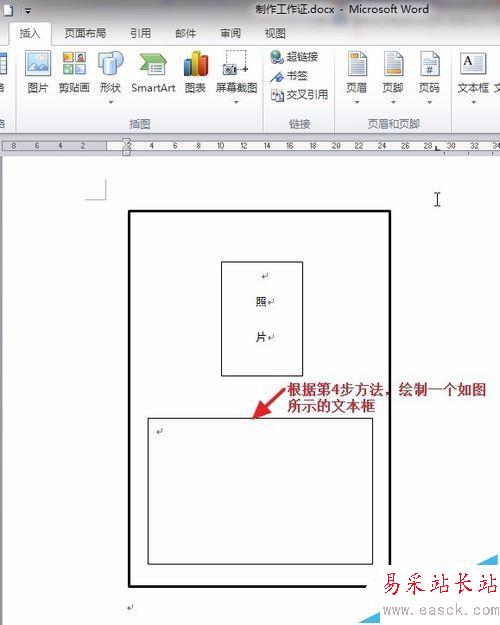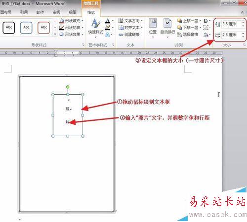 4、插入文本框,制作貼照片框:“插入”—“文本框”—“繪制文本框”,然后在畫布中拖動鼠標,繪制一個適當大小的文本框。然后修改該文本框的大小(高3.5*寬2.5),并輸入“照片”文字進行修飾。