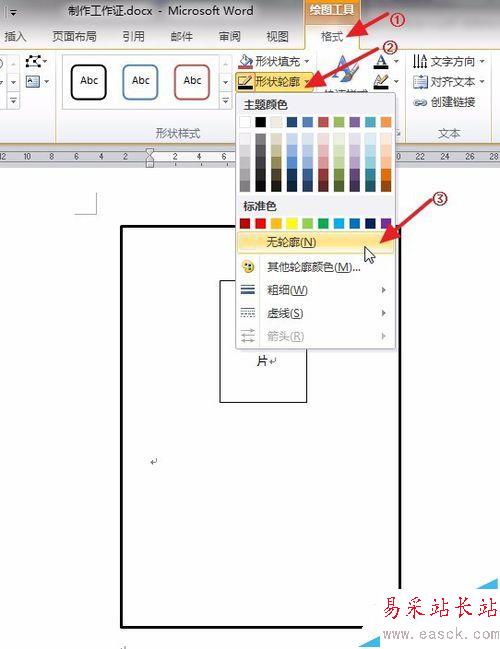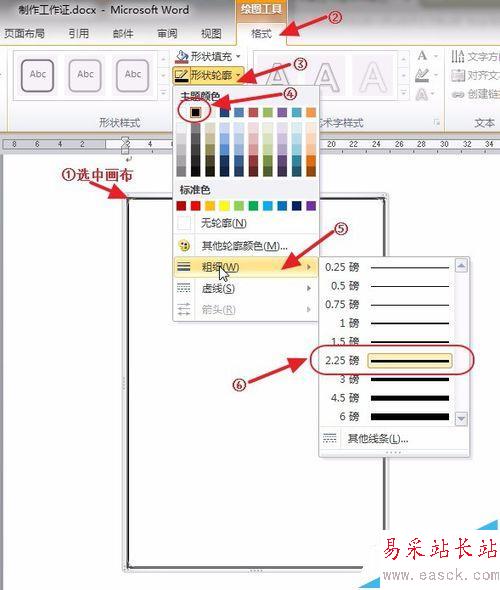 3、修飾畫布:為了方便最后的裁剪,可以給畫布加上一個邊框。選中畫布,在“繪圖工具”選項卡中,“形狀樣式”功能區中,對“形狀輪廓”命令的粗細和顏色分別進行設置。