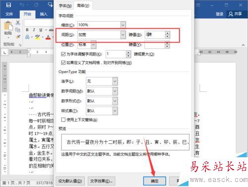 5、在高級(jí)選項(xiàng)卡欄下,在字符間距區(qū)域中,把間距設(shè)置為【加寬】磅值設(shè)置為【3】。然后在點(diǎn)擊“確定”按鈕。如圖所示;